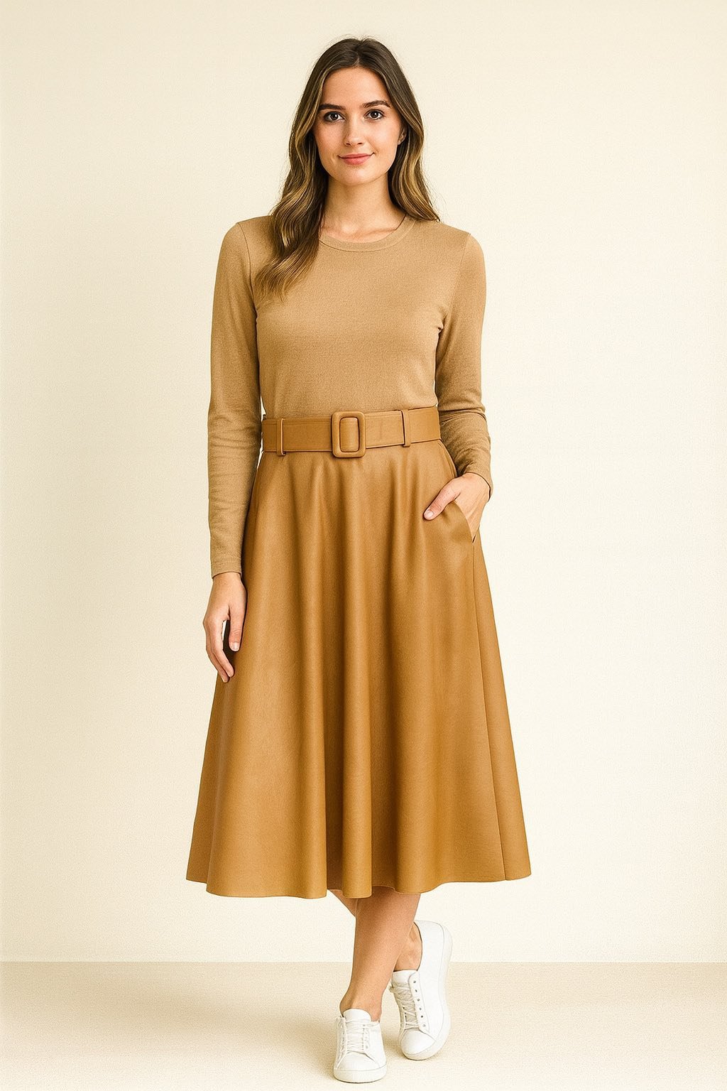 Γυναικεία Midi Φούστα Καφέ με Ζώνη