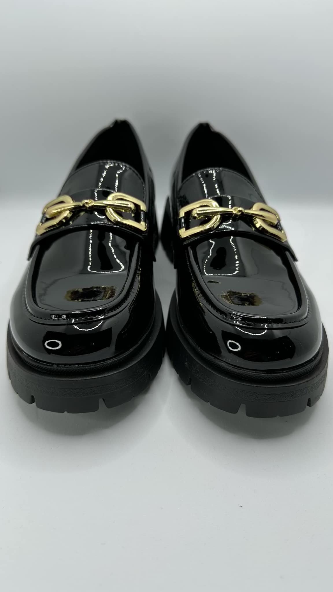 Γυναικείο Loafer Μαύρο λουστρίνι με χρυσή αγκράφα, τρακτερωτή σόλα και άνετο για όλη την ώρα .