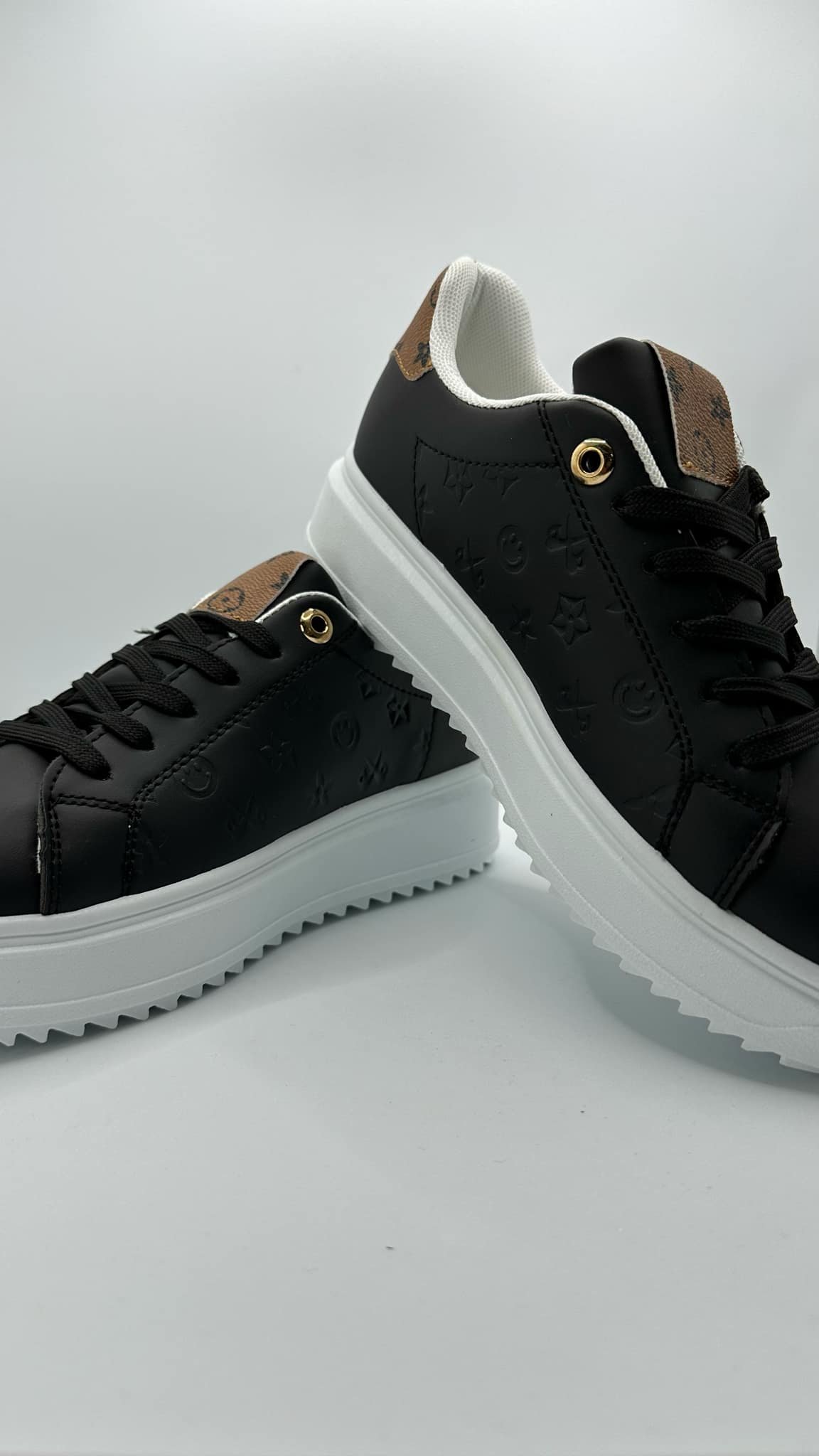Γυναικεια Sneakers Μαύρα, με χρυσές λεπτομέρειες και χρυσό μέταλλο. Κατασκευασμένα από δέρμα υψηλής ποιότητας, αυτά τα παπούτσια προσφέρουν μια τέλεια ισορροπία άνεσης και εκλέπτυνσης.